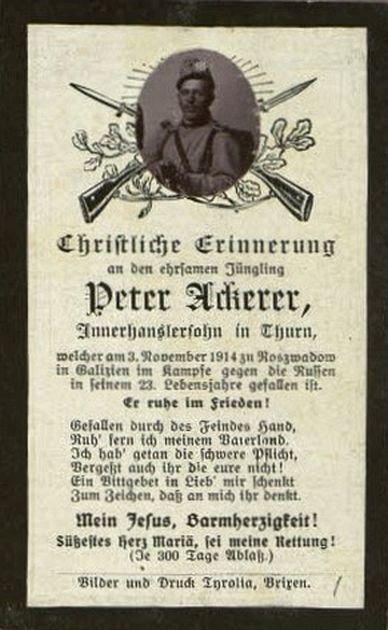 Jäger Peter Josef Ackerer, urodzony 28.06.1892 w Thurn był synem chłopskim, w cywilu pracował w gospodarstwie swych rodziców Andrä i Pelagii w Thurn. Kiedy wybuchła wojna, odbywał właśnie służbę zasadniczą jako żołnierz 2 kompanii I batalionu w 4 pcst . Choć na załączonym obrazku pośmiertnym, rodzina podała jako jego datę śmierci 3 listopada 1914, to faktycznie zginął parę dni wcześniej – najprawdopodobniejsza jest tu data 1 listopada, tj. data nocnego szturmu rosyjskiego i kontrataków mających odzyskać przejściowo utracone pozycje. Wynika to z dokumentacji sporządzonej przez c. i k. Inspekcję Grobów Wojennych w Przemyślu, wyraźnie wskazującej numer grobu, w którym go pochowano – 281. Mogiłę tą wykopali jeńcy rosyjscy w południe 1 listopada i tego samego dnia z pobojowiska ściągnięto kilkudziesięciu poległych, urządzając wspólny pochówek Tyrolczykom i żołnierzom rosyjskim.