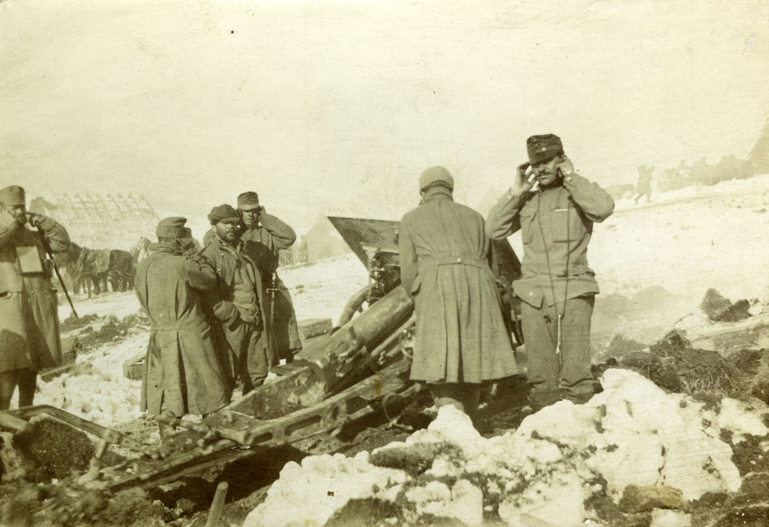 Haubica górska 10 cm M.10 prowadzi ogień z przełęczy 872 m w górnej części nieistniejących dziś Berehów Grn. Mogła wystrzeliwać szrapnele lub granaty kal. 104 mm na odległość do 6000 m, w tym przypadku w okolice Dwernika i rzeki San. Tego rodzaju dział obie strony walczące w Karpatach miały zbyt mało, nie wspominając o brakach w amunicji. W tle zabudowania wsi i przemieszczające się kolumny transportowe. Zdjęcie wykonano 2.04.1915 r. kiedy c. i k. 31 DP cofnęła się znad Sanu na Połoninę Wetlińską i Caryńską.