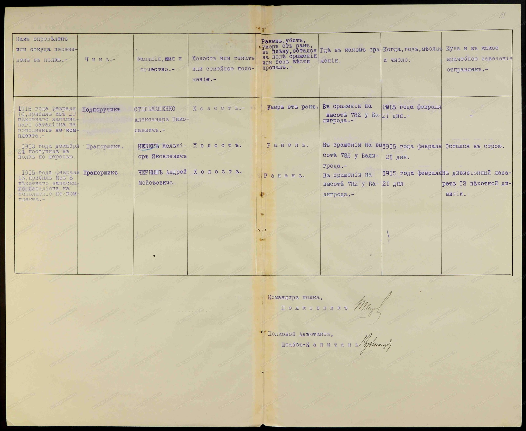 Przykład źródła rosyjskiego: fragment wykazu strat oficerów 52 Wileńskiego pp – w tym zmarłego z ran odniesionych 7.03.1915 na Piaskach.