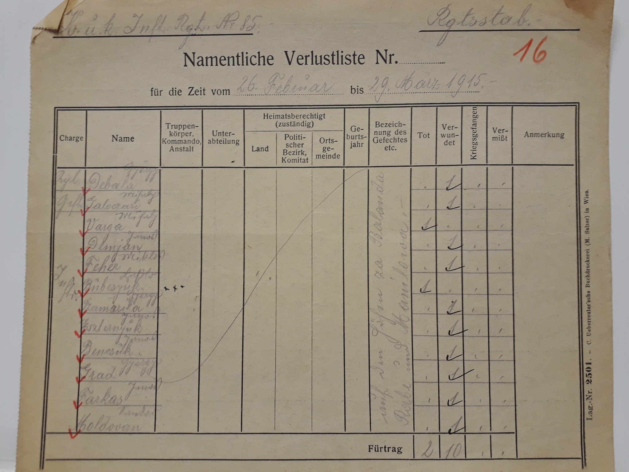 Z jednostek rosyjskich przedstawialiśmy straty 49, 52, 137 pp, inne oczekują ostateczne opracowanie. Z jednostek A-W przedstawialiśmy straty kuk IR 25, IR 32, IR 34, IR 41, IR 44, IR 69, IR 85, IR 86, IR 91, IR 94, kk LIR 1, LIR 25, LIR 36 – te dane w ujęciu monograficznym lub też przy okazji opracowywania danego rejonu lub miejscowości. Wstępnie opracowane są LIR 14 i LIR 24, istnieje również lista strat LIR 25 – to zawdzięczamy kolegom z Czech i niestrudzonej działalności Radima Kapavika.