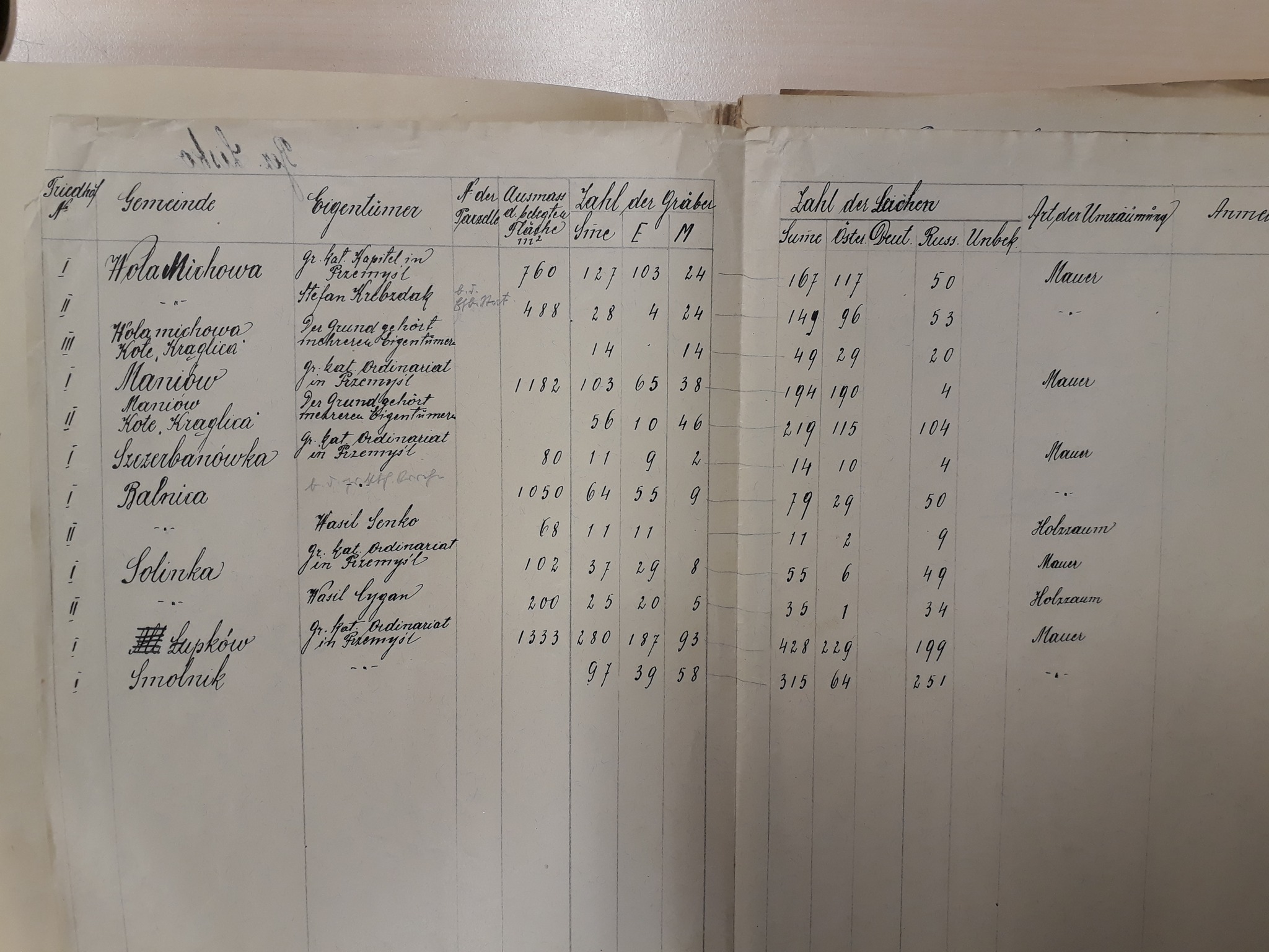 Co do Rosji, tak dokładnych danych nadal brak ze względu na późniejszy wybuch rewolucji bolszewickiej. Żeby mieć jakiś punkt odniesienia: od sierpnia 1914 do września 1915 r. armia rosyjska straciła bezpowrotnie nieco ponad 1 200 000 ludzi. Możliwe jest jednak badanie tych strat cząstkowo w oparciu o źródła archiwalne w odniesieniu do konkretnych jednostek, przedziałów czasowych i rejonów odpowiadających obszarom gmin.