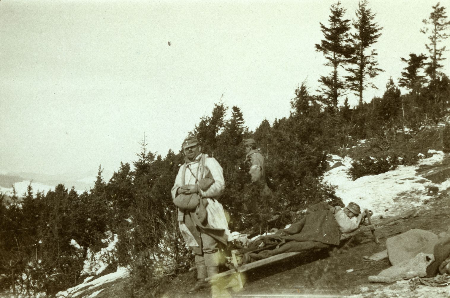 Ewakuacja rannego żołnierza kuk IR 79 z Kiczery Sokolickiej, tym razem warunki pogodowe panujące 20 marca 1915 r dawały rannemu gwarancję na bezpieczne dotarcie do szpitala polowego.