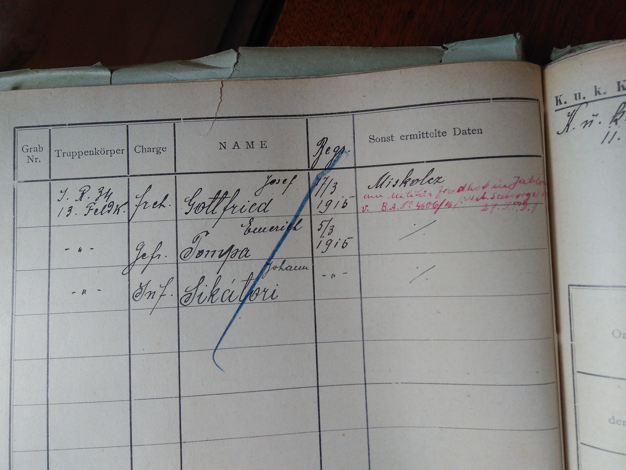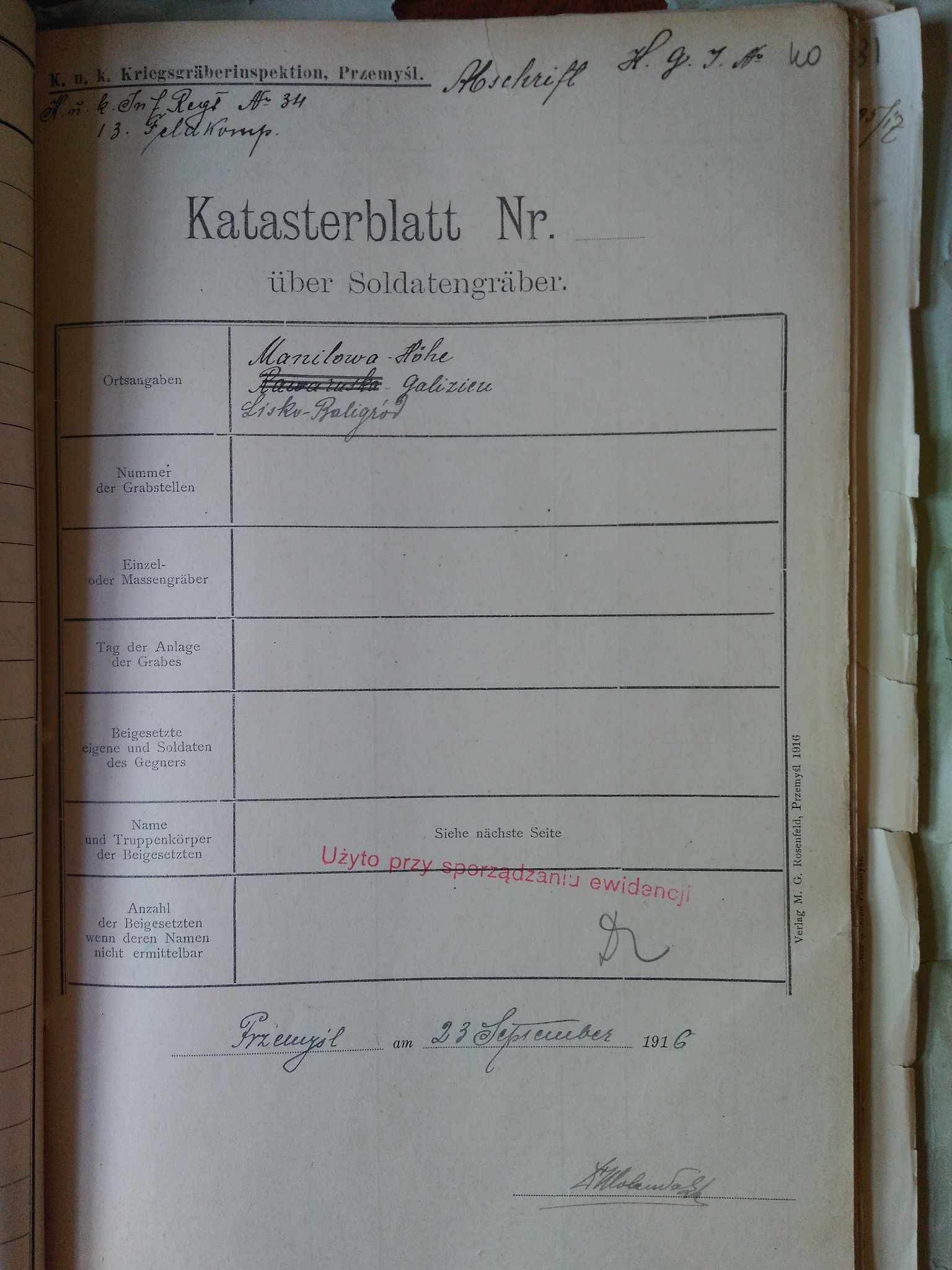 Dwie strony „Katasterblatt" odnoszącego się do Maniłowej i poległych z IR 34 – jak widać obowiązujący formularz posłużył jedynie do zinwentaryzowania danych. Ciekawa jest adnotacja czerwonym atramentem, mówiąca że zgodnie z informacją kapelana - dziekana 27 ITD wymieniony tam Gottfried József, KdtidR/Fähr został pochowany na cmentarzu w Jabłonkach.