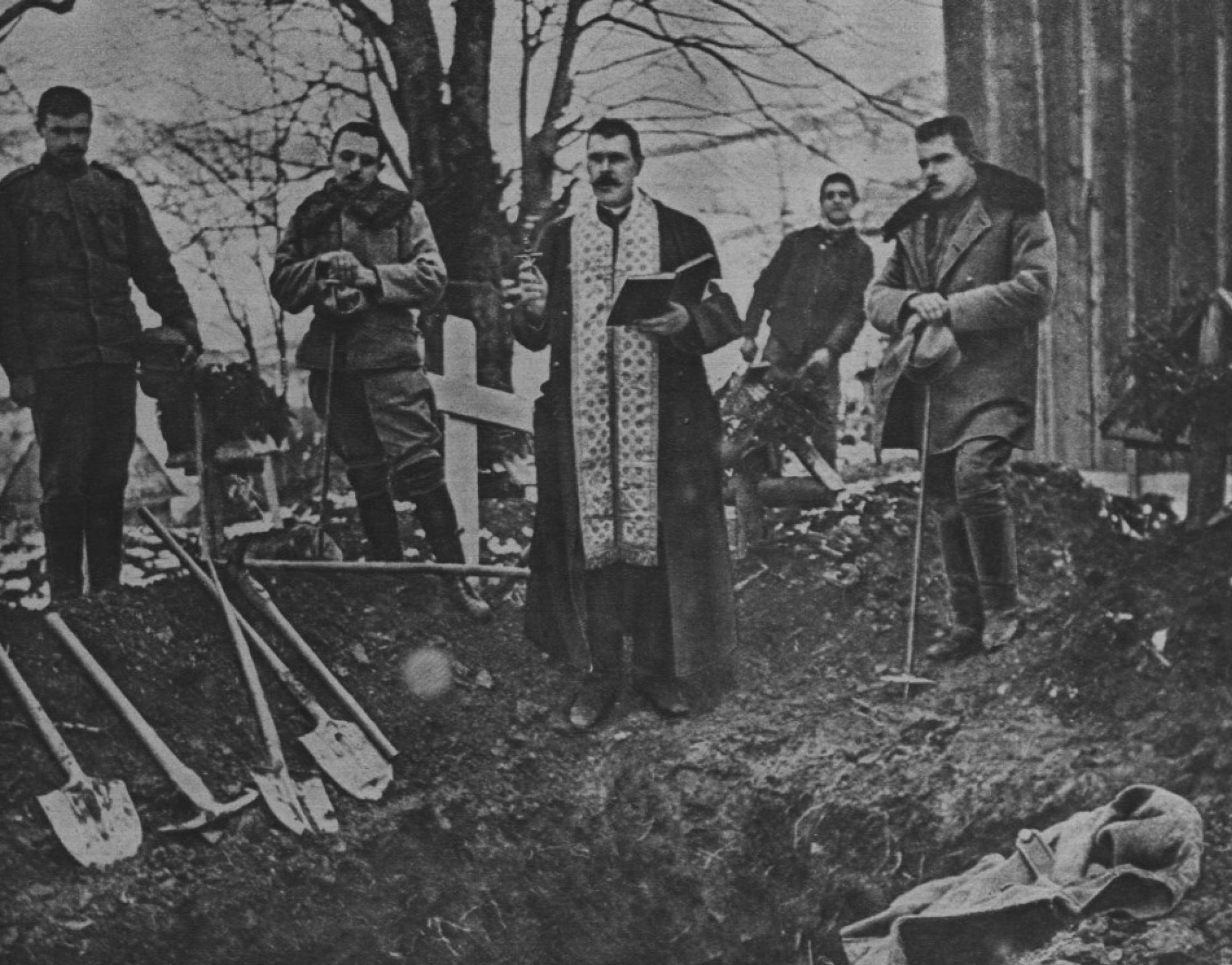 Pogrzeb poległego oficera koło karpackiej cerkwi, podobnie musiały wyglądać okoliczności pochówku Fahrn Gottfrieda z kuk IR 34.