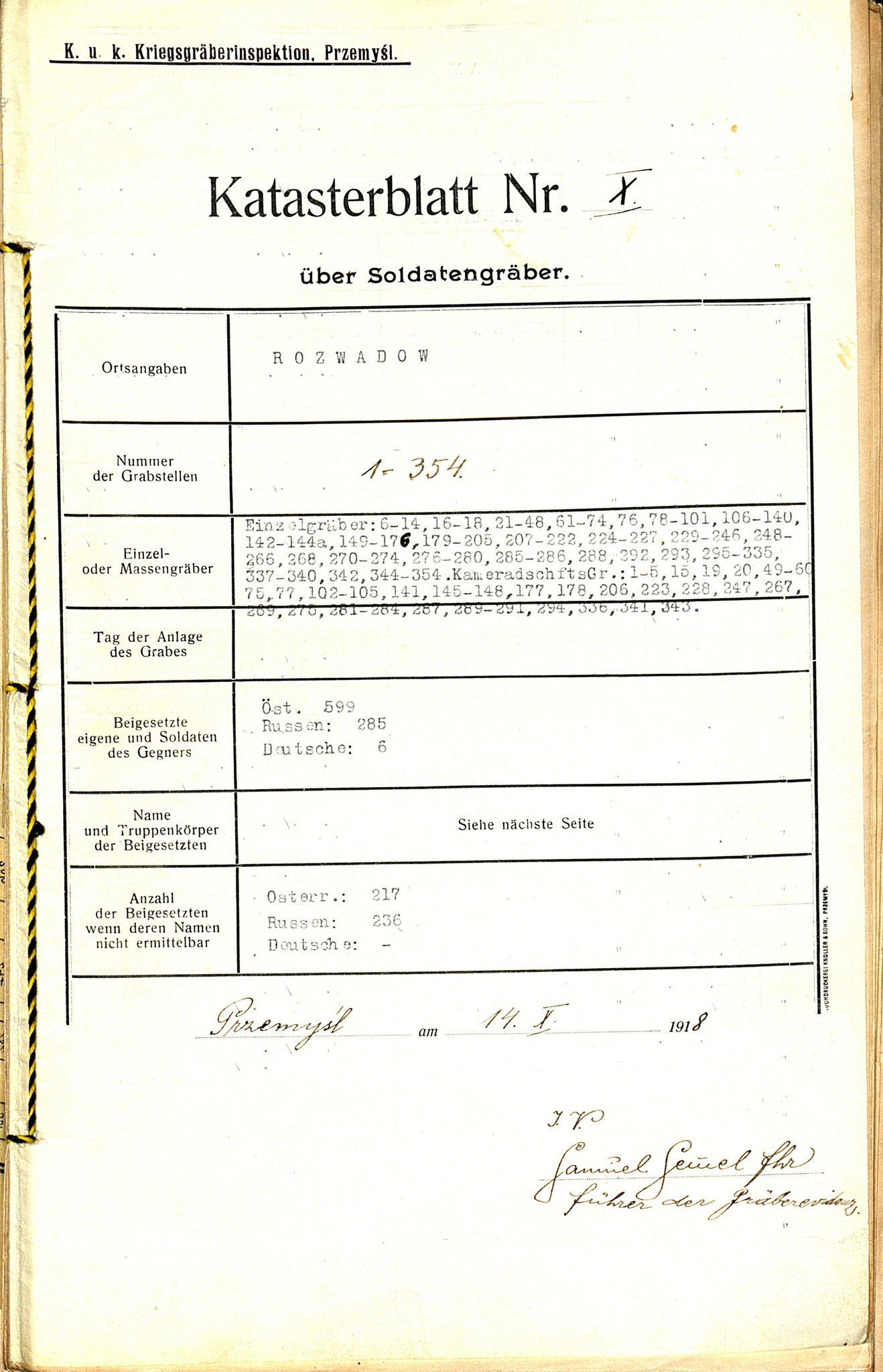 Przykład modelowo opracowanego Katasterblatt - cztery strony z obszernego dokumentu opisującego cmentarz wojenny w Rozwadowie. Wszystkie wymagane przepisem informacje zostały w nim zawarte. Co ciekawe, jest to dzieło tej samej Inspekcji Grobów Wojennych w Przemyślu, która działała również na terenie ówczesnego powiatu leskiego.