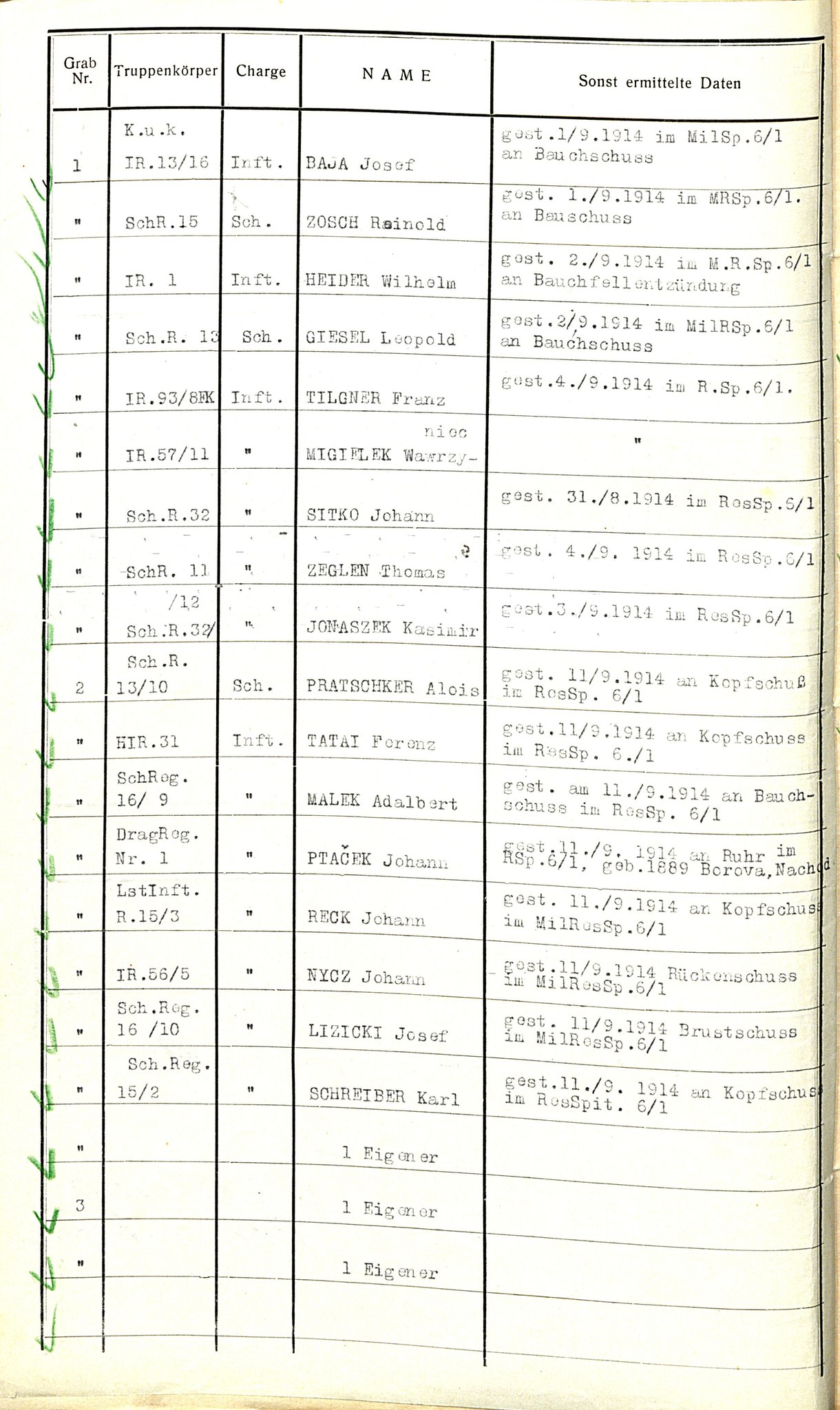 Wytyczne odnośnie dokumentowania pochówków i cmentarzy wojennych w Austro-Węgrzech wydano już w 18.03.1915 r. w rozkazie nr 31361 gen. Franza Kanika, d-cy tyłów kuk Armeetappenoberkommando. Następną taką regulację zawierał jego rozkaz z 26 sierpnia 1915 r. Oba te dokumenty znormalizowały dokumentację związaną z porządkowaniem pobojowisk i urządzeniem cmentarzy. Wprowadziły wzory spisu obiektów, tzw. karty katastralnej oraz karty ewidencyjnej grobu. Całość spraw z tym związanych prowadził następnie IX Abteilung Kriegsministerium w Wiedniu, jego organami wykonawczymi stały się Inspekcje Grobów Wojennych, lokowane przy dowództwach okręgów korpuśnych. Bieżącą ewidencję strat prowadziła każda jednostka wojskowa w dwojakiej formie: miesięcznych meldunków oraz wpisów do pułkowych ksiąg zmarłych.