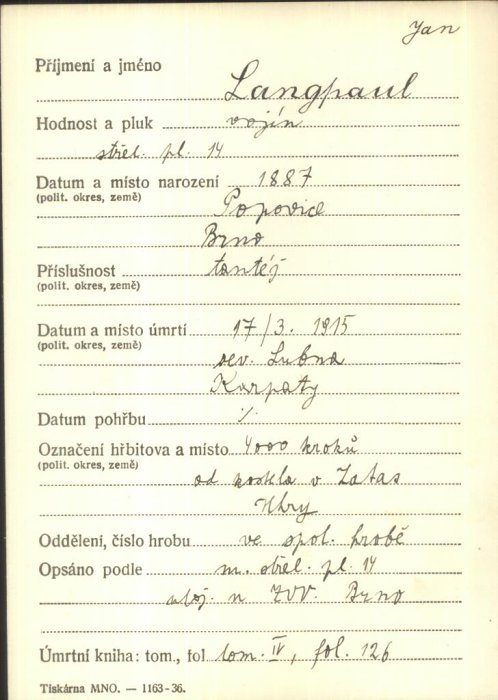 Karta poległego na płn od wsi Łubne żołnierza z kk LIR 14 pochodząca z VUA Praga.