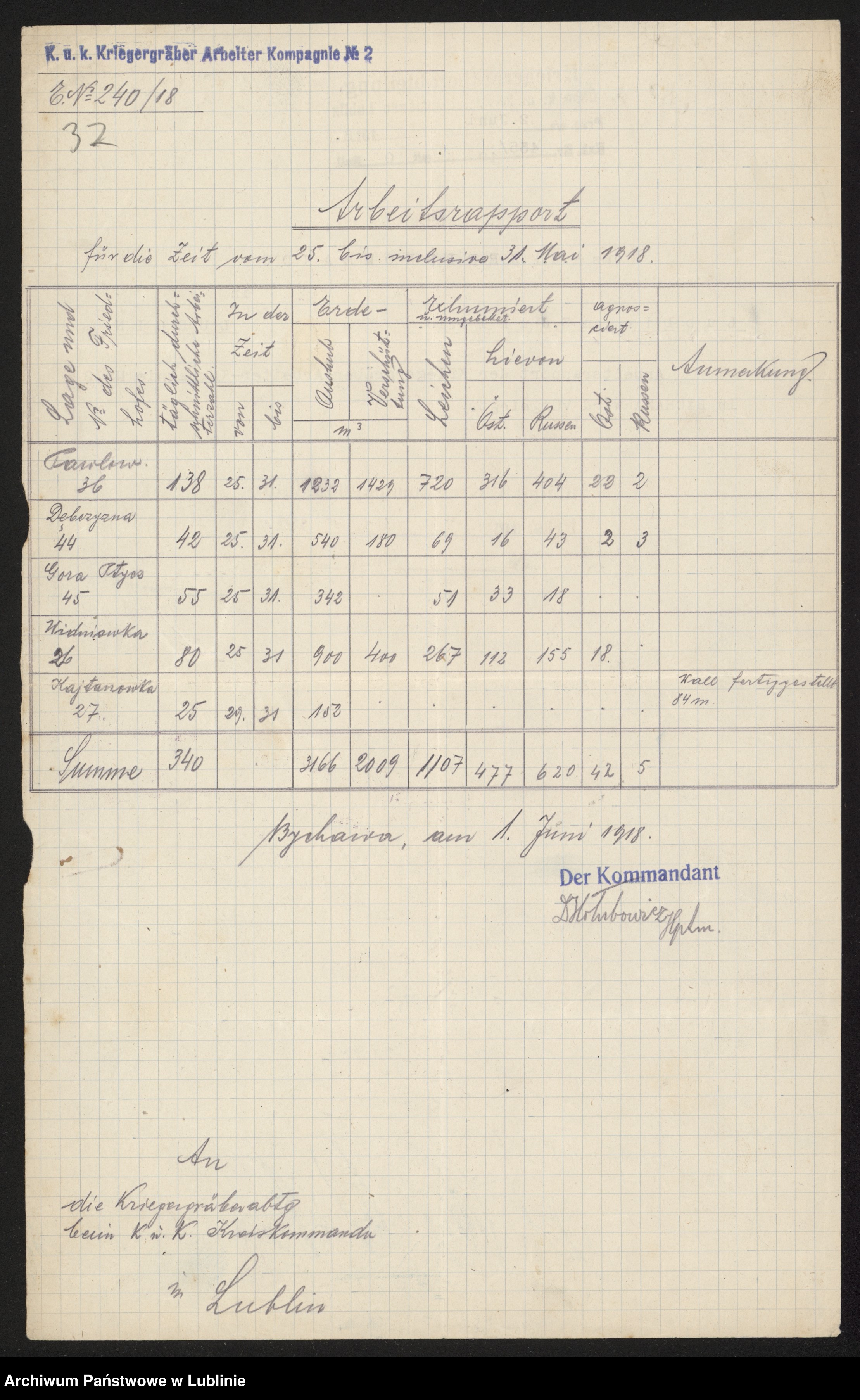 Wg oznaczeń kuk Kriegergräber Abteilung Lublin pierwotne miejsce pochówków na „Górze Ptycz" otrzymało nr 45, ten numer porządkowy obiektu pozostawiono po pracach przeprowadzonych w 1918 r. siłami 2 Kompanii Roboczej Grobownictwa Wojennego dowodzonej przez Lst. Oblt(potem Hptm). Ing. Hołubowicza. Pododdział ten dyslokowano z Bychawy do Strzyżewic w drugiej połowie kwietnia 1918 r. Już wcześniej dokonano przeniesienia części szczątków z obiektów w Kiełczewicach wskazanych wcześniej do komasacji. W początkach maja służący w nim żołnierze z pomocą mieszkańców Kiełczewic wykonywali ogrodzenie wytyczonego pola grobowego, np. w tygodniu pomiędzy 17 a 24 maja 1918 r. pracowało tu łącznie 44 osoby usypując 220 m3 ziemi wybranej z rowu wokół pola grobowego, w kolejnym tygodniu siłami 55 osób usypano 342 m3 nasypu i rowu. Ponadto pomiędzy 25 a 31 maja na polu grobowym pochowano też szczątki 33 żołnierzy austro-węgierskich i 18 żołnierzy rosyjskich, ekshumowanych z okolicznych cmentarzy 41 i 42 tj. pochówków położonych pierwotnie w Kiełczewicach Grn., w kier. na wsch., w pobliżu drogi biegnącej przez wieś.