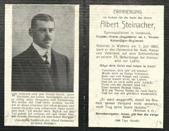 Steinacher Albert, EinFrw. Zgsf., kuk TKJR 1, *1883 Wattens, Insbruck, +7.07.1915 (Bild wie oben))