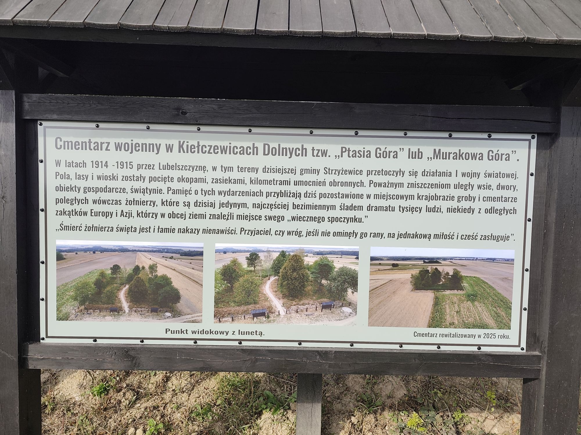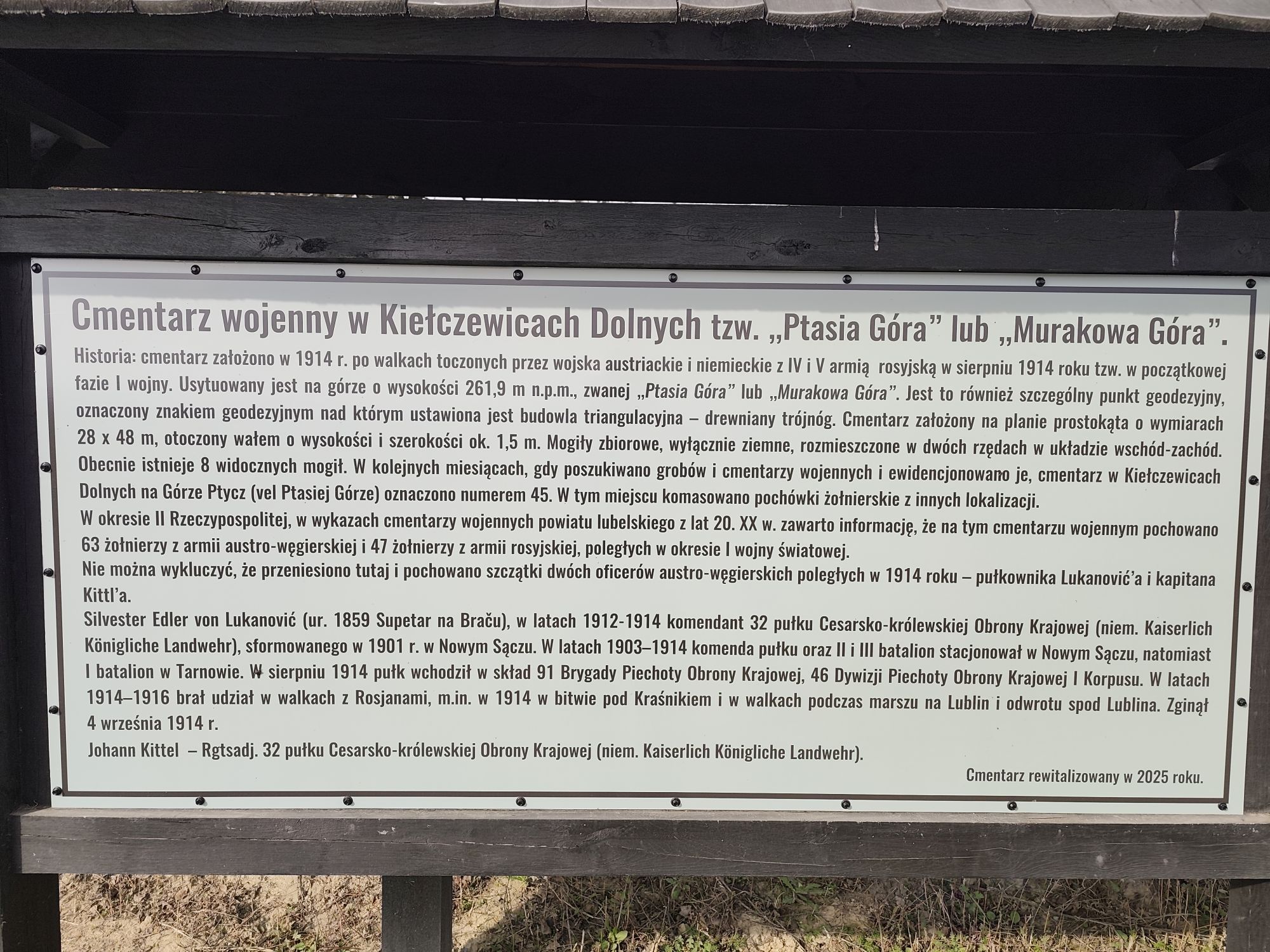 Cmentarz założono na planie prostokąta o wymiarach 28x48 m na szczycie wzniesienia 261,9 m npm (wcześniejsze pomiary mówiły o 260 m) w jego centralnej części ulokowano mogiły pojedyncze, a na obu skrzydłach groby masowe. Podczas zakładania cmentarza jako ogrodzenie wykonano wał ziemny, obecna jego wysokość wynosi ok 1,5 m. Ziemię do jego usypania pozyskano z rowu, którym okolono obiekt. Zastosowanie rowów, ziemnych wałów i kurhanów jest charakterystyczne dla terenów Lubelszczyzny, na które decydowano się w epoce ze względu na niskie koszty takiego rozwiązania (zainteresowanych tą problematyką odsyłam do naszych materiałów nt cmentarza wojennego w Janowie Lub, publikowanych wcześniej na FB i stronie www.) Dziś wskutek podorywania przez okolicznych rolników rów zanikł i jest prawie nieczytelny. Zdjęcie pierwotnego wyglądu obiektu nie zachowało się. Na terenie pola grobowego posadowiono punkt geodezyjny w postaci trójnogu o konstrukcji betonowej. Stoi tu też tablica z napisem do którego niestety wkradły się błędy: w wersji polskojęzycznej należało napisać „cmentarz wojenny żołnierzy austro-węgierskich i rosyjskich z 1914/15 r." W wersji niemieckojęzycznej oprócz ww pomłek, wystarczyło napisać „Kriegsfriedhof (ewentualnie: Soldatenfriedhof) aus dem Jahren 1914/15" – użyto zaś nieistniejącego słowa „der kirchol". Wg danych rejestru gruntów cmentarz wojenny zajmuje działkę nr 202 z obrębu 0008 (Kiełczewice Dln.), ma ona powierzchnię 0,157 ha. Do obiektu prowadzą gruntowe drogi gminne, ale ich stan w okresie prac polowych może być nie najlepszy. Sąsiadujący z cmentarzem punkt widokowy wyposażono w ławki i lunetę umożliwiającą oglądanie szczegółów wspaniałej panoramy, jaka się stąd roztacza. Sam obiekt otrzymał podczas rewitalizacji w 2025 r. ogrodzenie drewniane biegnące wokół wału ziemnego. Wykonano również wybrukowaną kamieniami polnymi ścieżkę do centralnego punktu cmentarza gdzie ustawiono monumentalny drewniany krzyż. Obok znajdują się tablice informacyjne, jakkolwiek rzetelnie opracowane, to nie zawierają ona planu pola grobowego i wykazu poległych. Wprawdzie wspomina się na niej o prawdopodobnym pochówku 2 oficerów kk LIR 32 Neu Sandez (tj. 32 pułku piechoty Obrony Krajowej „Nowy Sącz", w którym służyli głównie Polacy ze wschodniej części obecnego województwa małopolskiego) wskazując przy tym, że chodzi o dowódcę i adiutanta pułkowego. Ten fakt nie znajduje jednak potwierdzenia w Katasterblatt. Obst Silvester von Lukanović (rodem ze Słowenii) i Hptm. Johann Kittel faktycznie polegli 4 września 1914 r. od ognia artylerii rosyjskiej w okolicach Kiełczewic i zostali pochowani w Kiełczewicach Dolnych na tutejszym cmentarzu parafialnym (przy kościele) w dniu 5 września 1914 r. W świetle moich dotychczasowych badań jest niemożliwe, by podczas ekshumacji prowadzonych zimą i wiosną 1917/18 r., chociażby po znalezionych oznakach stopni, nie odnotowano w Katasterblatt faktu pochówku oficera starszego w randze pułkownika. Najprawdopodobniej szczątki obu oficerów pozostały w miejscu pierwotnego pochówku, bo z tekstu z tablicy umieszczonej przez potomków Lukanovicia w 2007 r., wynika że nic im nie było wiadomo o ekshumacji i przeniesieniu w inne miejsce szczątków dowódcy kk LIR 32 w okresie 1915-18. Wiadomo, że żona płk Lukanovicia, Anna na pewno żyła do 1918 r. bo udzielała się w akcjach charytatywnych na rzecz wdów i sierot po poległych, żył też jego syn, który latem 1916 r., po ukończeniu Tejrezjańskiej Akademii Wojskowej, jako podporucznik rozpoczął służbę, właśnie w kk LIR 32. Jeśli szczątki Lukanovicia przeniesiono, to musiało by to nastąpić dopiero po roku 1918, a dotychczas nie natrafiłem na dokumenty z okresu II RP, który by to potwierdzał. Można tylko mieć nadzieję, że w miarę szczegółowego opracowywania kolejnych cmentarzy wojennych w okolicy uda się wyjaśnić całą sprawę.
