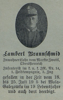 - Braunschmid Lambert, Inft., kuk IR 14, 1 Kp., *1896 Zwettl, Urfahr, Grn Austria, +17.07.1915, MGr. 1, VL 286 Sterbebild