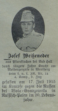- Weisseneder Josef, Inft., kuk IR 14, 4 Kp., *1896 Kremsmünster, Steyr, +17.07.1915, MGr. 1, VL 286, Sterbebild